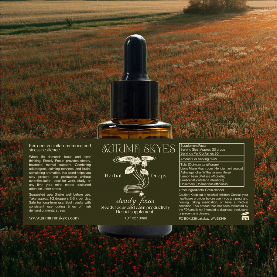 Skullcap: calms an overreactive mind and helps release physical tension that interferes with focus.
